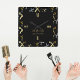 Stilrent personlig klokke design for frisører med falskt gull og sølv saks mønster på svart bakgrunn. Teksten er fullt tilpassbar.