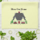 Ett underbart mysigt hus med mörk grått tak och en röd ytterdörr. Träd och en gångväg. säger: "Bless our home"