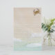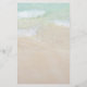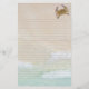 Skriva papper med strandbakgrund och blå krabbild överst. Söt strandtemat privat- eller kontorsmateriel för handskrivna personliga anteckningar till vem som helst. Båda sidor är dekorerade med sand och surfa som innehåller tropiska turkosa blå vatten. Vågar kommer uppifrån från grund på framsidan och nedåt från baksidan. Light grått linjer är endast på framsidan av pappra.