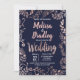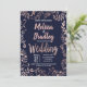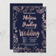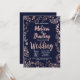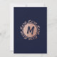 Elegant, chic och modern faux-tryckt ro guld blommigt löv och penselskripttext på marinblå bröllopsinbjudningar. Denna klassiska och sofistikerade utformning är perfekt för det trendig och det snyggt som gifter sig. Anpassa med ditt eget meddelande på framsidan och en anpassad inledande monogram på baksidan. All fotoutskriftsdesign.