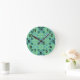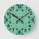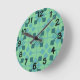 Denna väggklocka har en modern utformning av pilar i mitten av århundradet i två blå nyanser på fält i grönten av sjöcellen.
