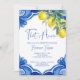 Blå Maiolica-plattor citroner Italienska inbjudningskort för möhippan, redigerbar mall direkt nedladdning, mediterrana temat möhippa citrus inbjudningskort för möhippa