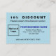 Få ut fler kunder. Få fler kunder att köpa dina produkter eller liknande tjänster genom att erbjuda rabatt. Annonsera även ditt företag, befordra ditt varumärke namn eller bygg medvetenheten om namn. Anpassa det här rabattkortet genom att ange rabatten i procent som du vill erbjuda, giltighetsdatum, logotyp för ditt företag, angivande av ditt företags eller företags namn, adress och mobila nummer. Rabattkortet färg är ljusblått och teckensnittet färger är mörk blått och svart. Kontrollera utseendet när du har laddat upp logotyp och skrivit in text. Om utseendet passar dig kan du ställe din beställning nu. Om du behöver ändra storlek på och flytta logotypen och texterna så att de passar på det här rabattkortet eller på andra former och storlekar som du väljer, ändra designen i verktyg. Du kan också göra andra ändringar enligt dina önskemål i designen verktyg, t.ex. ändra rabattkortet färg, teckensnittet färg, teckensnittet stil, redigera texter, lägga till text och ta bort texter.