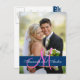 Blått vykort för bröllopsfoto för Tack. Byt ut exempelfotot mot ett eget foto från bröllop, lägg till ett monogram och namn och tack för bröllop... Elke Clarke© for Monogram Gallery. Kontakta luxuryweddinginvitations@gmail.com om du vill ha en annan färg.