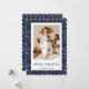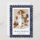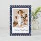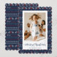 Nostalgiskt blått, rött och vitt, fult fotografi av God jul med Jultomten, renar, snöflingor och träd. Anpassa enkelt det här fula helgdag-kortet med ditt foto och din familj namn.