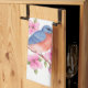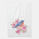 Denna nätt kökshandduk presenterar en blåsångare på en gren med rosa blommor.