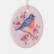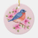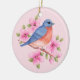 Denna keramiska prydnad har min målning av en blåsångare på en gren med rosa blommor. Prydnaden är 2 5/8" och kommer med ett band. Du kan tillfoga text på baksidaen för att personifiera.
