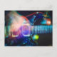 Ett levande skott av en elektrisk gitarr fylld med energi från en livekonsert som visar strängar, frets, nacke och magnetisk plocka på kroppen av gitarren, som är ett mycket populärt, modernt, strängt musikinstrument.