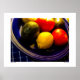 Lägg lite färg till din värld med den här Poster, ett originalfoto av frukt i en koboltblå skål. Vissa citroner, avokado och tomater tillsätter gult, grönt och rött till blandningen, allt i varm gult. Under fotot finns en liten text med titeln: Blue Bowl of Fruit, och artist: Image by L.M.Glenn.