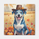 En vattenfärgsmålning stil av ett muntert sitta i hund i en hög av pulserande höst löv, omgiven av små pumpor och spridda hörn. Hund bär lite pilgrimhatt och beams med glädje, och fångade Thanksgivingens anda. I bakgrunden skapar mjuk skörd fält och träd med gyllene hud en fredlig landskapsambians. Struktur och varma, nedsmutsade hösttonar ge är en mysigt, nostalgisk perfekt för att fira säsongens skönhet.