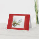 Julkort med blåskrika på en tallgren med röd glittereffekt.
