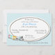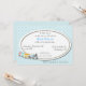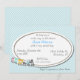 Söt, kontrollerad babyduschinbjudan. Bild av en akvamarin och vit liten schaktad mönster, som bakgrund, och ett vitt ovalt textområde, i mitten. Cute tecknad tåg i pastel färg dekorerar det nedre lämnat hörnet. Anpassa texten till kostym som party behöver.