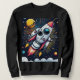 En raketraket från stil blastar av till en färgstark, stjärnkosmos. Det är lekfullt designat med stort ögon och ett vänligt ansikte, och lägger till lite stollig till scenen. Raketens härliga avgasspår och de vibrerande planeterna i bakgrunden skapar en känsla av dynamisk rörelse och äventyr.