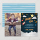 Söta platta tack-kort för din lilla rymdutforskares födelsedag med en raket, stjärnor, planeter och moln mot en natthimmelsbakgrund, med "tack" och ditt personliga meddelande och din signatur. Anpassa med ett favoritfoto av födelsedagspojken för en cool personlig touch.
