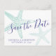 Elegantens turkosa blått och marinstjärnfisk sparar datumkortet för ett badbröllop som du kan utforma online med textval färg och typsnitt. En enkel utformning av eleganten med en traditionell marin kustdesign. Perfekt för tropisk födelsedagsfest, strand, ö, målbröllop eller strand.