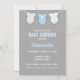 Cute Baby Shower-inbjudan i ett blått och grått färg-schema, med en illustration av baby kroppsdräkter i en garderob. Den här designen är perfekt för en Boy Baby Shower firande.