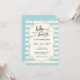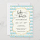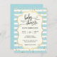 Trendig ännu söta inbjudningskort för babydusch i svart kalligrafi-skript i svart brev. Vitt och ljust pastellblått strimlat mönster på ett glitter-ge som ser modern ut. Faux guld konetti för duscheffekten. Perfekt för pojke babyduschen. Hämta matchande klistermärken!
