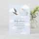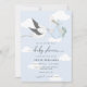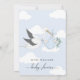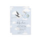 Fira Morsa som ska vara med den här vismska storken, inbjudan till babydusch. Utformningen har en söt, handdragen slagg och en blå himmel med flytande vita moln.