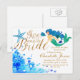 Blå korall akvarell under havet söta lilla sjöjungfru tema med rubrik "Här kommer bruden" kommer till liv med gyllene glittereffekt. Bröllopsinbjudan postkort. Detta kommer att förvandla din marina bröllopsfest till en fantastisk vattenvärld för gästerna. Perfekt inbjudan för fester på stranden eller vid havet.