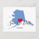 Anpassningsbar färg blå Alaska karta-form med en sparad datumutformning. Anpassa lägesformen färg så att den matchar paletten bröllop färger. Berätta för dina vänner och din familj var bröllop ligger med en hjärttextsymbol som du kan flytta. Både det moderna och elegant kalligrafteckensnittet stilar är anpassade. Ändra färg i den här designen.