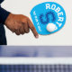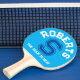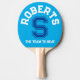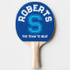 Personlig pingpongpaddel med ditt namn och din familj namn initialt och team eller slogan i vitt, cyan blue och mörk blått, den ena sidan har bakgrund i cyan himlar blå den andra mörk blått. Läser Roberts S laget att slå. Anpassa detta djärva sportpaddel fladdermus från stil med ditt eget namn och starta och lagera namn eller lägg till en slogan. Designad av www.mylittleeden.com på zazzle.