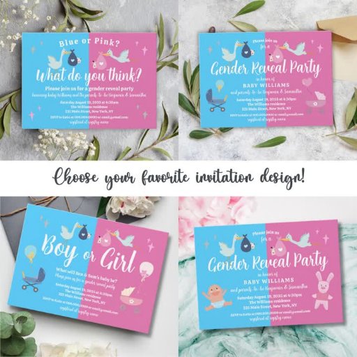 Baby-förutsägelser och råd om det föräldrakort som gästerna kan fylla på genderna visar party. Ljud ut fråga dina gäster kan spela. Utformning i blått och rosa med söta illustrationer av storkfåglar som levererar flicka och pojke. Anpassa eller ändra teckensnitt, färg och text genom att klicka på knappen för att redigera designen.