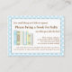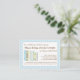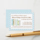 En charmerande dikt begär att gästerna tar med sig bok för att baby ska kunna starta den nya mamman med en bibliotek av älskade barns bokar. Sätt bara in det här söta kortet i babyduschkuvertet. Den beundransvärda baby blue, gult- och mint-färg-planen med en söt liten rad av matchande bokar gör en perfekt som är utformad för att koordinera med nästan varje inbjudan till babydusch för en pojke.