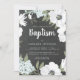 En vacker blommigt Baptisminbjudan som passar en liten pojke eller flicka. Den här designen har en omgivning ram av vattenfärgsvita anemoner, grönt löv och finkänsligt blåa blommor på en kritersbakgrund. ord-"Baptism" är i ett vitt, modernt teckensnitt med penselbokstäver i stil och dina händelsedetaljer finns i modernt sans serif-teckensnitt. Baksidan är i fast, ljusblå form med lodrät vitt rand.