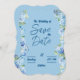 Meddela din speciella dag i stil med det här vackert designade kortet "Spara datum" i bröllop. Den här inbjudan har delikata blå blommigtar och ett skript för elegant på en mjuk blå bakgrund och anger en romantisk ton för bröllop i oktober. Kortet belyser datumet bröllop (Söndag 12:e) och tiden (6 EM), skapar både fångsten i öga och informationen. Perfekt för par tittar för en skönhets- och enkelhetsblandning i deras bröllop-stationär.