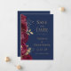 Den här eleganten har ett modernt bröllop spara datum-kort gräns av burga blommor och guld faux foil löv. Anpassa texten guld-färgad på en marin blå bakgrund. Kortets baksida är fast marin blå.