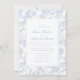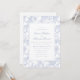 Inbjudan dina kära i stil med den här blåa blommigten till bröllopsinbjudan. Utformningen har ett ömtåligt botaniskt mönster i mjukt blått, som skapar ett tidlöst och romantiskt utseende. Perfekt för klassiskt, vintage eller elegant bröllop, den här inbjudan anger tonen för ett sofistikerat firande och lämnar ett bestående intryck på dina gäster.