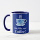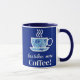 Mugg i ett stiliserat kaffe i kopp fylls med ett blått blommönster och fylls med stigning ånga. Under frasen "mindre talang, mer kaffe!" tillfogas en humoristisk, relativ perfekt för kaffe älskare.