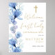 Denna eleganta dammiga blå genomskinliga blomstermönstrade välkomstskylt för första heliga kommunion kan anpassas med din information i chic typografi. Designad av Thisisnotme©