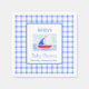 Handmålad sjöfärgssegelbåt, blått checkkort gräns med blått typsnitt som komplement till roligten, informell och visuell utformning. Tidlös!