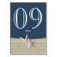 Starfish och burlap-tryckt bordsnummer-kort som komplimanger vår Beach Amore-inbjudan som är satt i marinblått, kan vara personlig och beställas individuellt. Alla delar av det här kortet skrivs ut. Det finns ingen riktig överlappning eller snäckor.