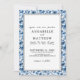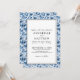 Blått botaniskt mönster Elegant blommig bröllopsinbjudan. Denna eleganta design förenar klassisk sofistikation med modern enkelhet. Med en raffinerad blandning av handskriven script-typografi och ett klassiskt serif-teckensnitt. Framsidan har raffinerad svart text ramad av en ren dubbel linje-kant, med en antydan till det mjuka blå blomster-mönstret som försiktigt ramar in kanterna och knyter samman fram- och baksida. På baksidan ger det fullständiga blå blomstermönstret med mjuka vita och subtila gråa accenter en graciös botanisk charm som frammanar en touch av vintage-inspiration.