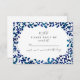 En inbjudan från elegant bröllop r.s.v.p. med en illustration av blått löv runt kant. Bakgrunden är vit.