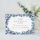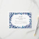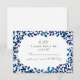 En inbjudan från elegant bröllop r.s.v.p. med en illustration av blått löv runt kant. Bakgrunden är vit.