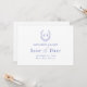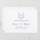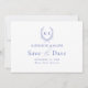 Elegant bröllop sparar datumet med en vit bakgrund med ett monogram omgivet av en botanisk vapensköld/ram med ett blått band. Anpassa den efter dina behov. Du hittar matchande produkter i min butik.