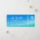 En avslappnad- och bröllopsboardingtid på strandpromenad över destinationsbröllopet flygplan biljett sparar datumkortet med en ombre turkos och blå vattenfärgad övertoningsbakgrund. Flygplanet och färg är alla redigerbara i den avancerade designern.