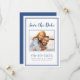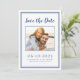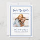 Modern, enkel Spara Datumfotot med ram-design har din favoritbild bild i förlovningen som ramas av en chic med klassiskt blått ram på en skarp vit bakgrund. Anpassa och din förlovning och bröllop-information med dina gäster i blått brev och skript. Utformningen kompletteras med en modern dubbla ram i blått. Konfigurationsdesign för liggande porträtt (bredd är underbarare än höjd) fungerar på ett utmärkt sätt med nära foton eller rektangulära foton av dig och din fantasi på en scenisk plats. Använda din fantasi och välj din favorit! Kontakta invitationsuites@gmail.com med frågor eller anpassningsbar.