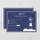 En elegant och en marin blå OSA kort med en illustration av en fyr för ett marint och sjömanligt tema bröllop! Byt bara information och skicka den till dina gäster!