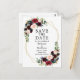 Elegant Watercolor Burgundy Blommigt Spara Postkort för meddelande om Bröllop omfattar burguny ro, blåa blommor, rosa ros, rödblommor och grönska på ett guld-geometriskt ram.