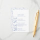 Förbättra charmen hos din romantiska rustik bröllop firande med detta sofistikerade och polerade menykort. Den här vackra designen har en imponerande mönster, försedd med delikata ljusblå blommor, upphöjt med personifiering och visar namnen av bruden och brudgummen på motsatt sida. Perfekt för att lägga till en extra-liten allure till din speciella dag.