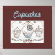 Tre blå cupcakes i ljust blått och brunt är fokuspunkten för denna konstaffisch. Designen är från en original vattenfärg-målning.