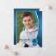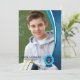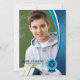 Ett unikt examensbevis med en draperiram i blå och vit färg och med en blå bandstämpel. Baksidan har ett öppet utrymme om du vill använda denna design som en inbjudan till en examensfest.