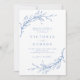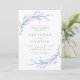 Den minimalistiska blåvita och vita bröllopsinbjudan, elegant hand, illustrerade utandningen av botaniskt löv, med händelseinformation i modernt skript och klassiskt typsnitt. Enkel och lyx. Underbar för det moderna klassiska bröllop, rent formellt bröllop, elegant botaniskt trädgårdsbröllop. Visa alla matchande delar i samlingen.