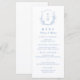 Monogrammad initialer inramad med elegantens vapensköld och handillustrerad botaniskt löv, menyinformation i elegantens skript och klassiskt teckensnitt, enkelt och lyxt. Underbar blå och vit meny för det moderna klassiska bröllop, rent formellt bröllop, elegant botaniskt trädgårdsbröllop. Visa alla matchande delar i samlingen.