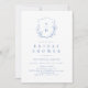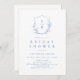 Blå och vit minimalistisk inbjudningskort för möhippan, med ditt monogrammade initialer inramat med elegantens vapensköld och hand illustrerat botaniskt löv överst. Din händelseinformation visas nedan i modernt skript och klassiskt teckensnitt. Enkel och lyx. Visa alla matchande delar i samlingen