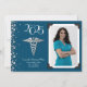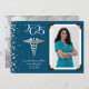 Fira den nya medicinska doktor i student från läkarskolan med silver och sjöblått medicinskt caduceus studenten meddelande! Elegant med en vintage foto gräns och silver konetti accents! Perfekt för vem som helst som utexamineras som md eller har med doktorat att göra!